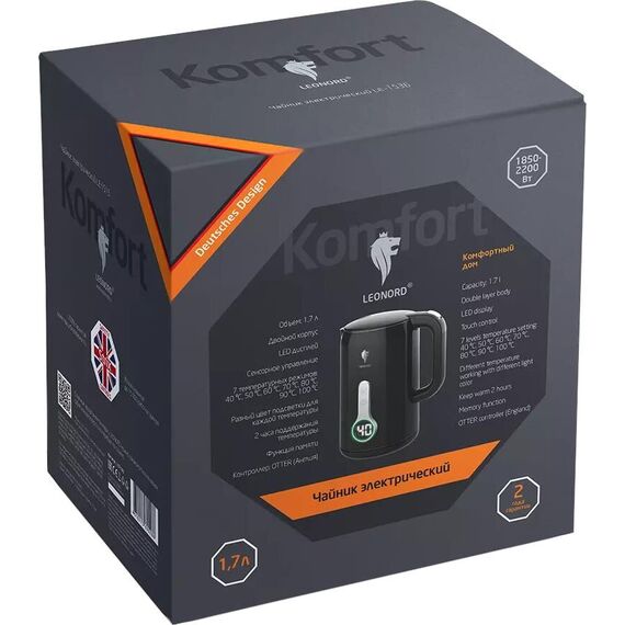 Мощность 1850-2200 Вт Объем 1,7 л Двойной корпус (нержавеющая сталь внутри,пластик снаружи) LED дисплей Сенсорное управление Установка температуры:40℃,50℃,60℃,70℃,80℃,90℃,100℃ Разный цвет подсветки для каждой температуры Поддержания температуры 2 часа Функция памяти Поворот на подставке 360° Защита от работы без воды Автоматический выключатель Контроллер OTTER (Англия) Гарантия 2 года Длина шнура 79 см