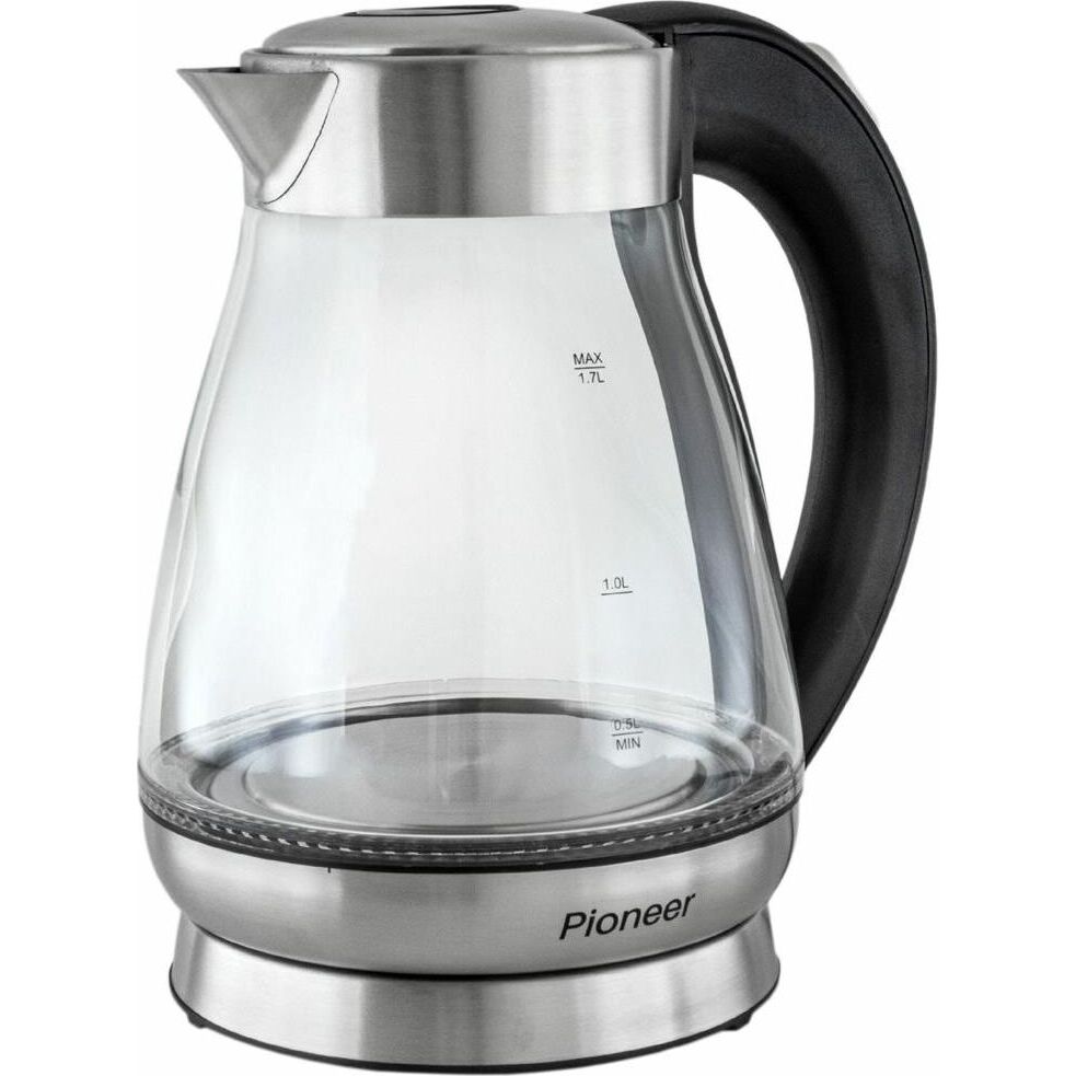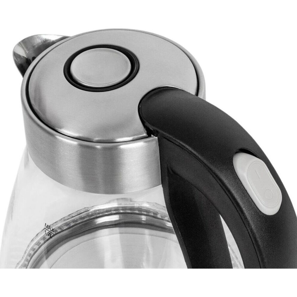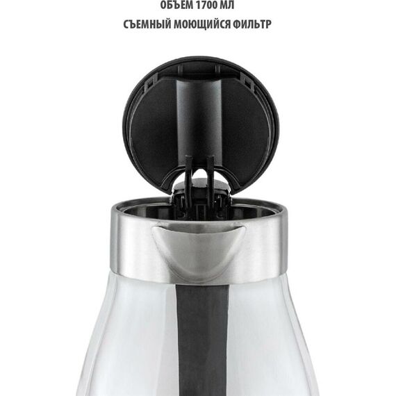 Максимальный объем, л.: 1,7 Тип нагревательного элемента: диск Способ открывания крышки: автоматический Подставка с вращением на 360 : есть Фильтр: съемный моющийся Отключение при закипании: есть Отключение при отсутствии воды: есть Индикатор уровня воды: есть Подсветка: есть Комплектация: чайник, гарантийный талон, инструкция на русском языке Материал корпуса: термостойкое стекло Цвет: металл, черный Максимальная потребляемая мощность, Вт.: 2200 Электропитание, в., Гц.: 220-240, 50