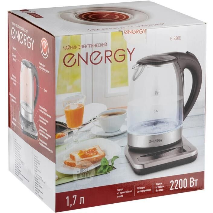 Объем 1.7 л Корпус из термостойкого стекла Шкала уровня воды Внутренняя подсветка Сенсорное управление LCD дисплей на подставке поддержание температуры Установка температуры нагрева: 40℃, 50℃, 60℃, 70℃, 80℃, 90℃, 100℃ Закрытый нагревательный элемент из нержавеющей стали Поворот на подставке 360° Защита от работы без воды Автоматический выключатель Мощность 1850-2200 Вт
