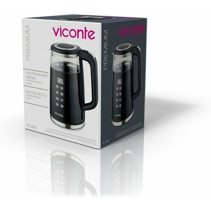 Электрочайник Viconte VC-3329 1,7 л, Электрочайник, 2200 Вт, 1,7 литра, корпус из высококачественного термостойкого стекла, закрытый нагревательный элемент, возможность вращения чайника на 360°, электронное управление, 13 температурных режимов, шкала уровня воды, автоматическое отключение при закипании, автоматическое отключение без воды.