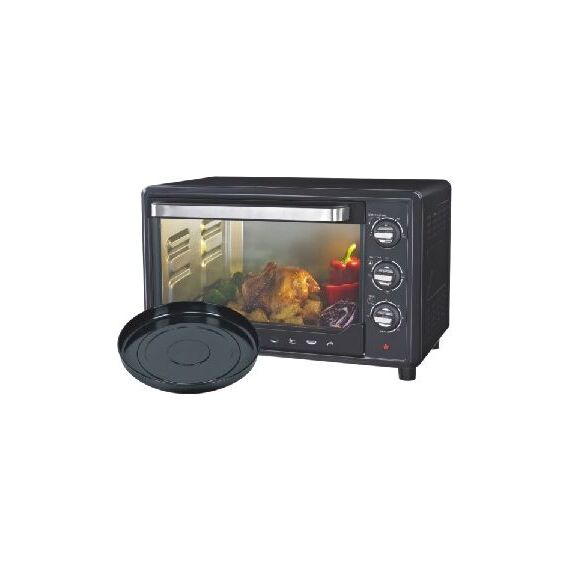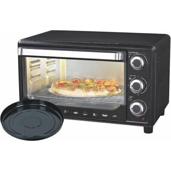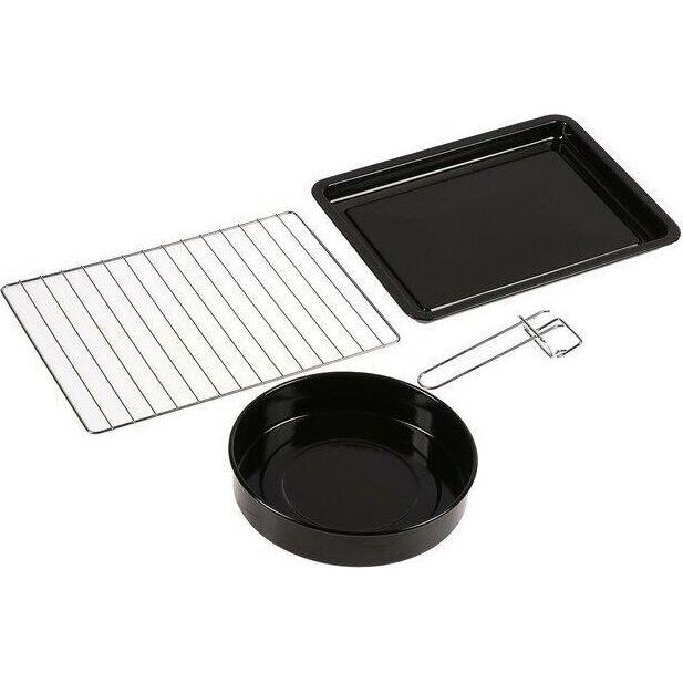 35л, духовка 1600Вт, механ.управление, 3 режима работы духовки (верх, низ, верх+низ), таймер на 60 минут, регулировка температуры духовки, комплектация - металлическая решетка, противень, круглая форма для выпечки (230х50 мм), ухват. Цвет: чёрный.