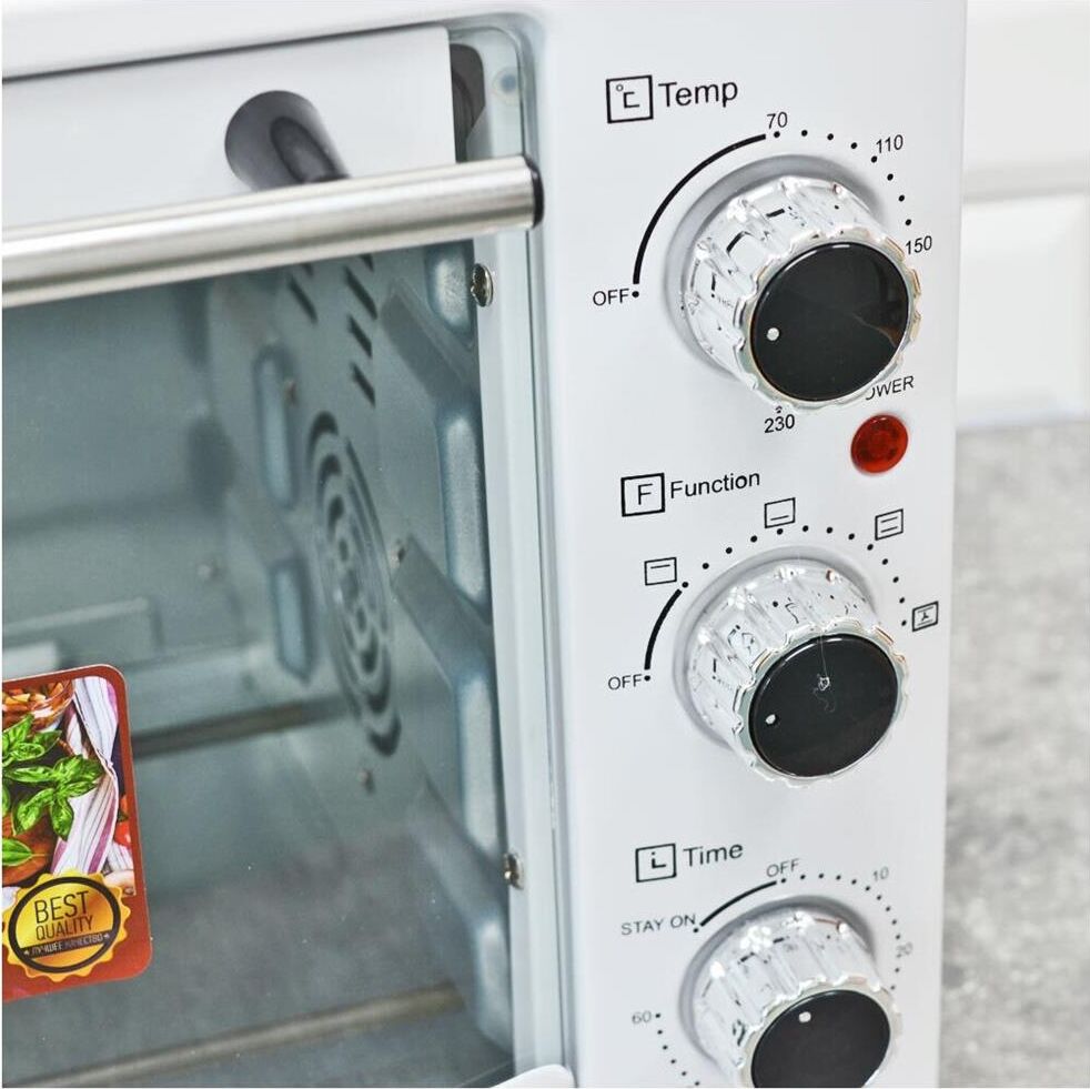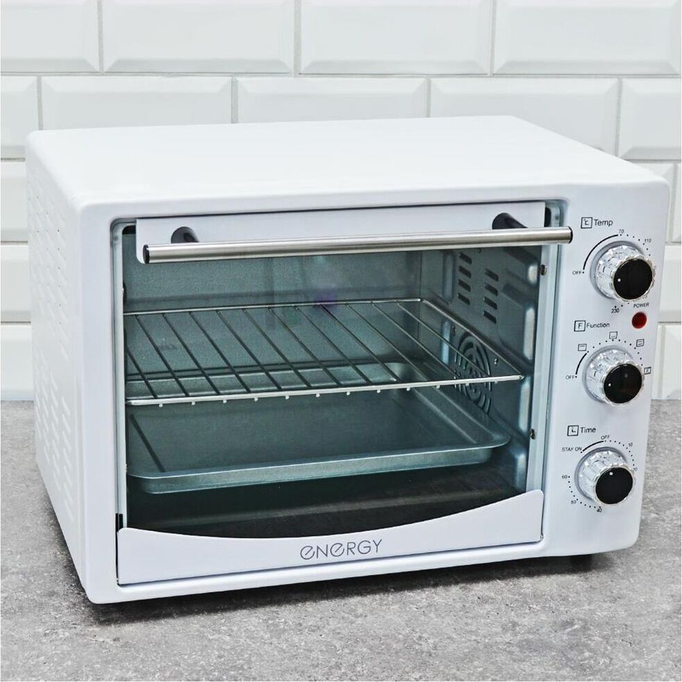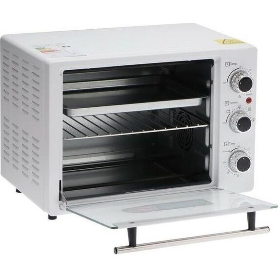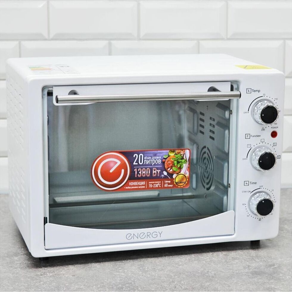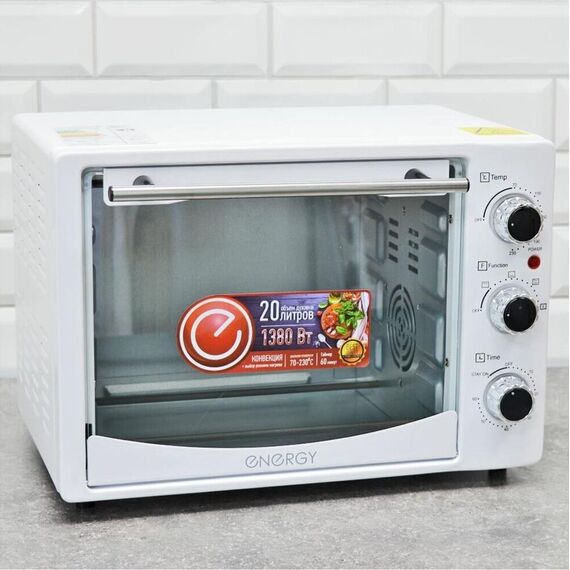 Внутренний объём 20 л. Термостат с диапазоном температур 70-230С. Таймер 60 мину.т 3 режима работы (верх, низ, верх+низ). Конвекция .Индикатор работы . Металлическая решетка, противень. Мощность 1380 Вт. Цвет белый. Класс энергоэффективности B.