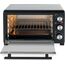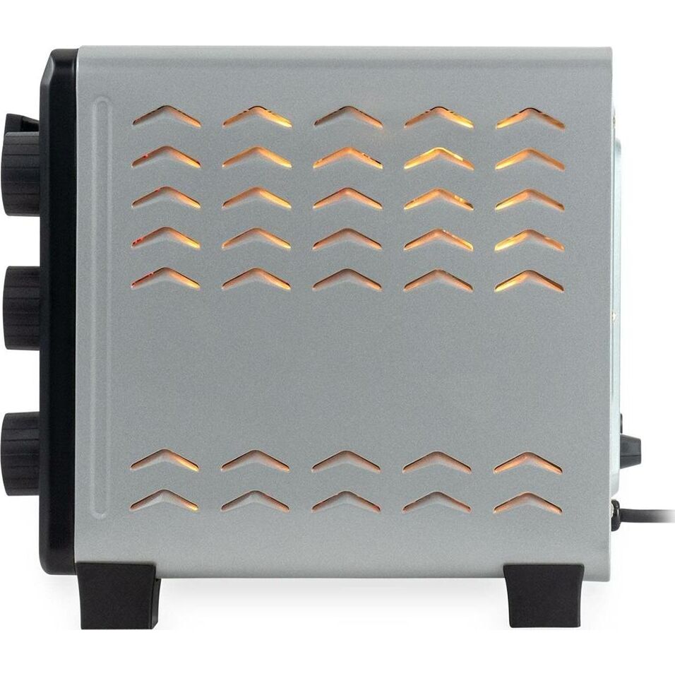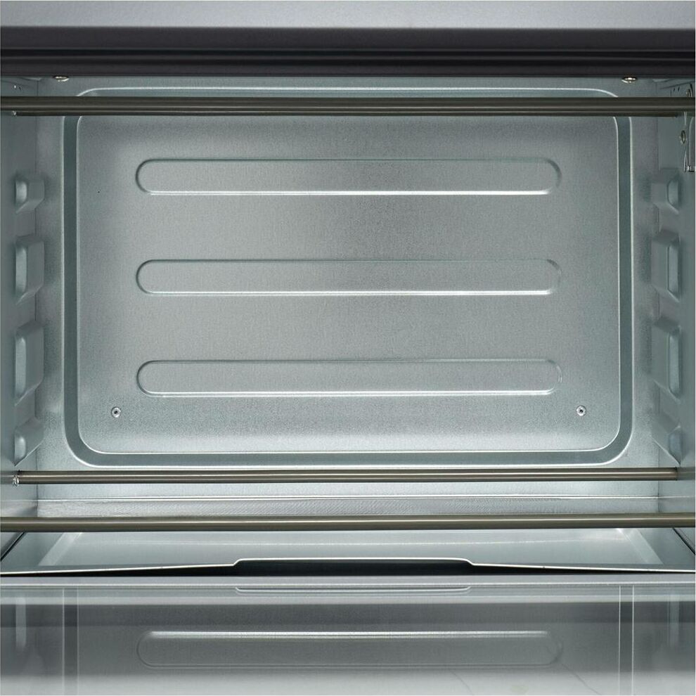 1500 Вт, объем камеры 23 л, серебристый корпус и часть фронтальной поверхности, панель управления черного цвета, декоративные элементы из нержавеющей стали и хрома, таймер на 120 мин + функция "работа без таймера", температура нагрева до 250 C, 3 режима работы (верхний нагрев, нижний нагрев, одновременный верхний и нижний нагрев), Напряжение питания 230 В; Частота 50 Гц, световой индикатор, Механический тип управления, ножки с нескользящей опорой, внутренняя подсветка, современный дизайн, Аксессуары: эмалированный прямоугольный противень, решетка гриль, ухват для снятия противня, поддон для сбора крошек и масла, Размеры без упаковки (см): 46,7x35x29 и Вес нетто без упаковки (кг): 5,8