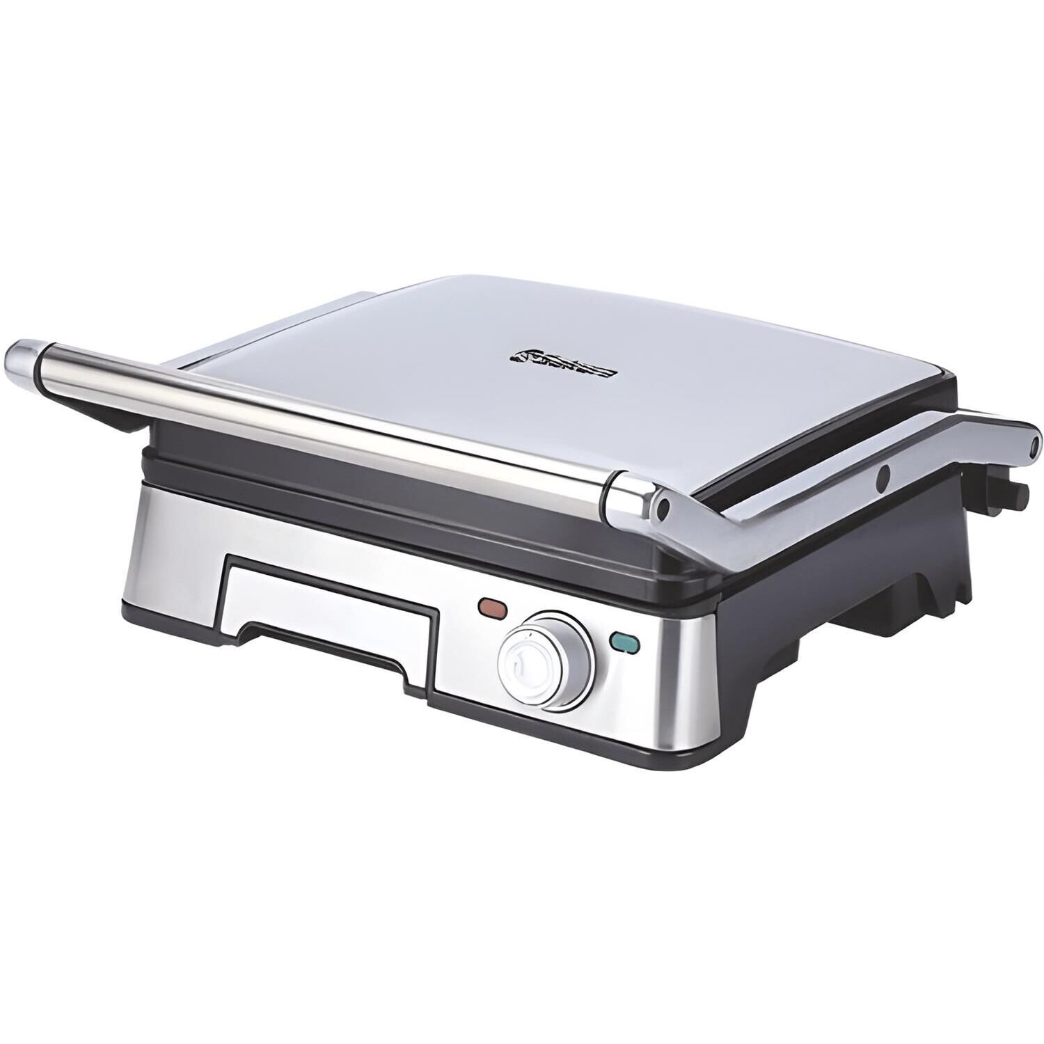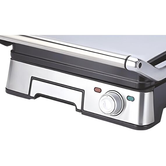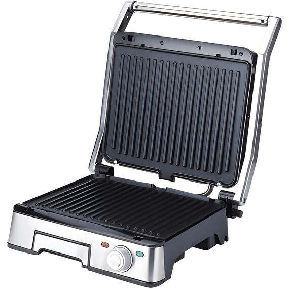 1800 Вт, жаропрочное антипригарное покрытие, регулируемый термостат (160-240°C), открытие панелей на 180°, съемные панели 290*230 мм, световой индикатор работы/нагрева, контейнер для сбора масла, защита от перегрева, горизонтальное хранение и транспортировка, 220-240 В, 50/60 Гц. Цвет: серебристый/черный.