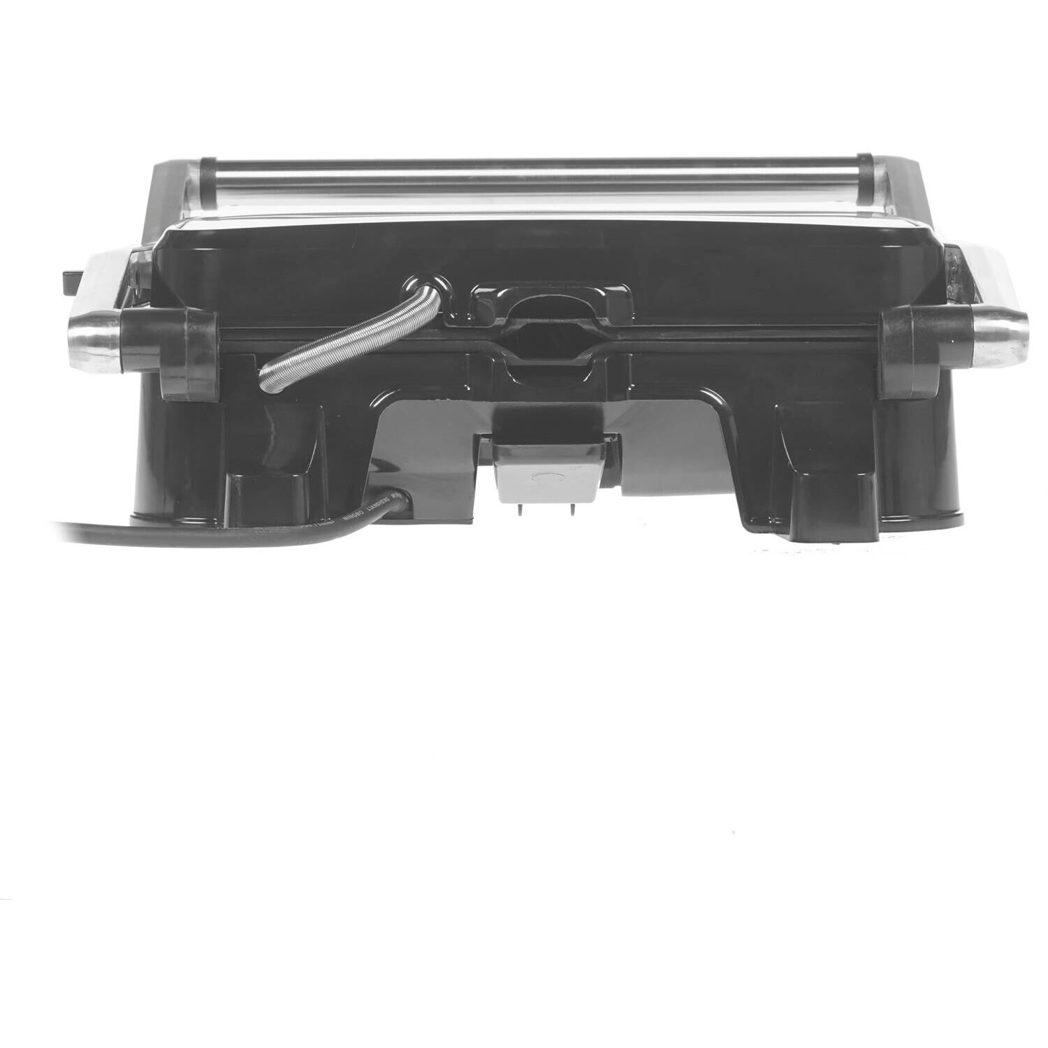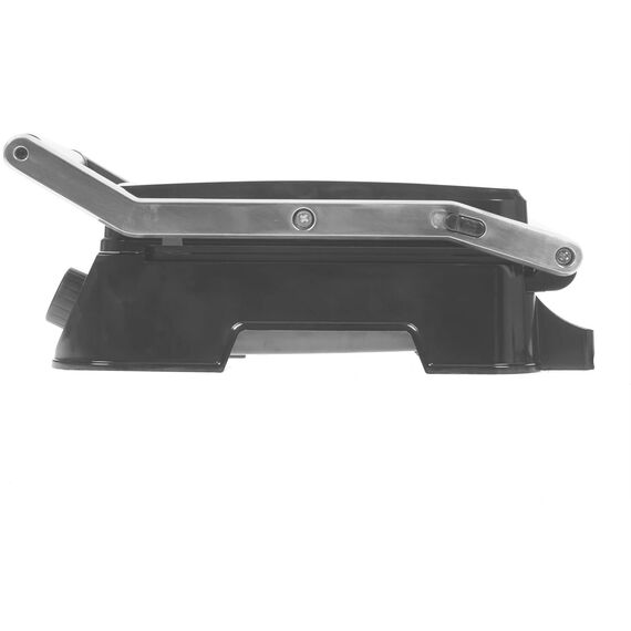 Номинальная потребляемая мощность 2200 Вт. Размер жарочной поверхности 29,5х23,5см. Регулируемая температура нагрева жарочных поверхностей 0-220С. Эргономичная ненагревающаяся ручка. Желоб для слива сока или жира. Съемный поддон для сбора жира или сока. Противоскользящие прорезиненные ножки. Два режима работы: сэндвич-гриль, открытый гриль (барбекю). Возможность приготовления в режиме «Открытый гриль». Защита от перегрева. Цвет: cеребристый.
