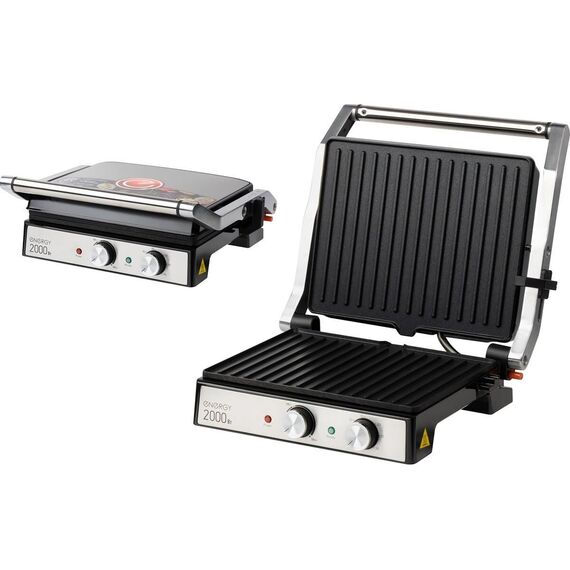 Гриль Световой индикатор работы и нагрева Терморегулятор Таймер на 30 минут Ненагревающаяся ручка Прорезиненные ножки Корпус их термостойкого пластика и металла Открывание на 180 градусов Мощность 2000Вт Размер: 29*23см Длина шнура 75 см