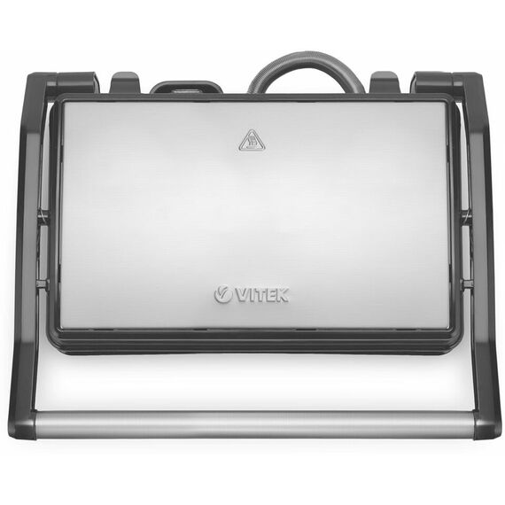 Гриль-пресс. Потребляемая мощность: 750 Вт, Покрытие панелей: антипригарное, Размер панелей: 23 х 14,5 см, Способ открытия крышки: 180 и 90 градусов, Цвет: Серебро/черный