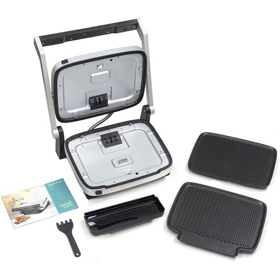 Контактный гриль Мощность: 2000 Вт Напряжение: 220-240В, 50/60Гц Сенсорная панель управления на ручке 7 автоматических программ 4 степени прожарки стейка 2 съемные жарочные панели 30х25см Антипригарное покрытие панелей Съёмный поддон для сбора жира Авторегулировка высоты верхней панели Материал корпуса: металл