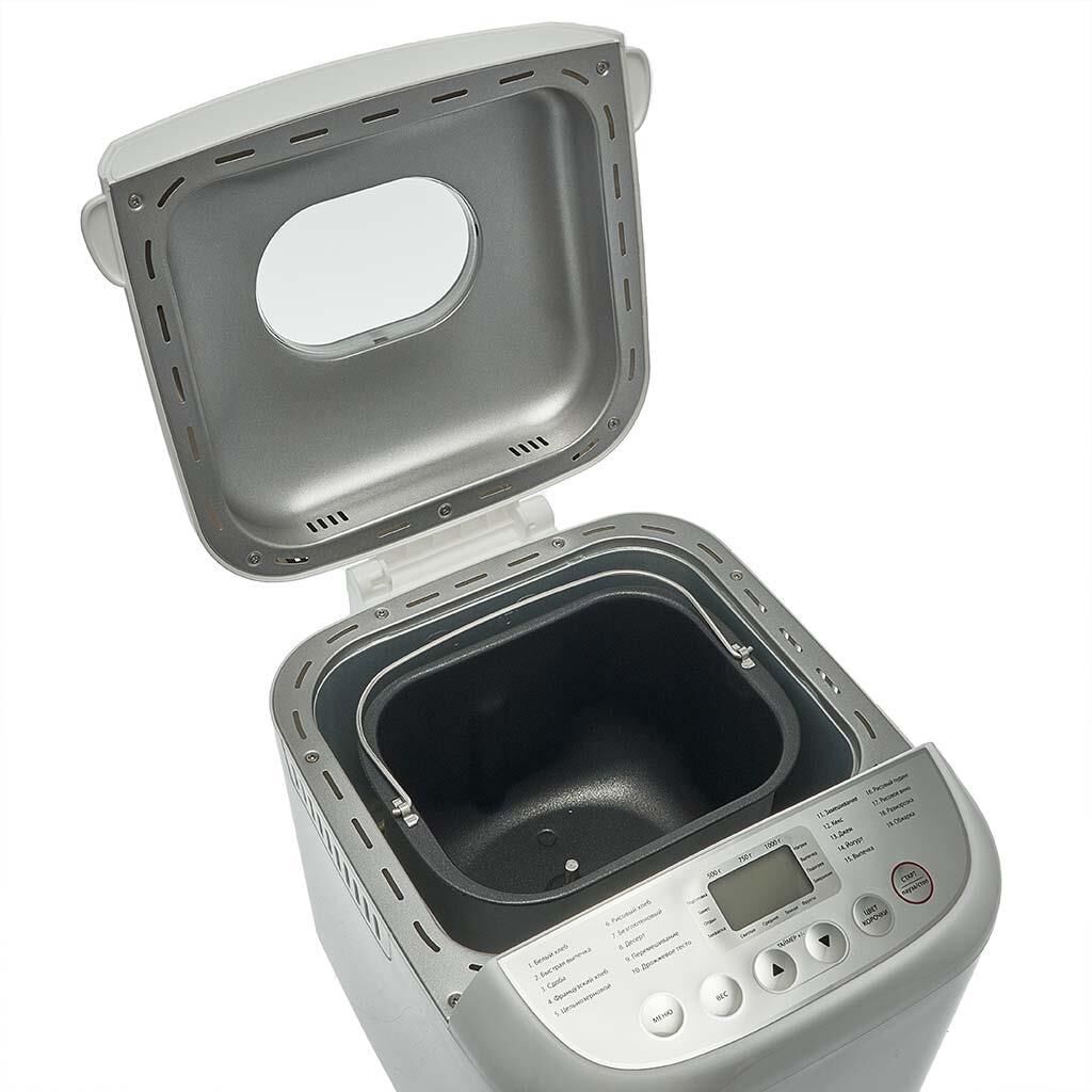 Номинальная потребляемая мощность 600 Вт Вес выпечки 500/750/1000 г Объем формы для выпечки 2 л Объем мерного стакана 240 мл Таймер отсроченного приготовления до 15 часов Цвет: белый Форма для выпечки и тестомешалка с антипригарным покрытием LCD-дисплей Двухсторонняя мерная ложка: 1 чайная и 1 столовая ложка Крюк для извлечения тестомешалки Противоскользящие ножки Функция «Отложенный старт» до 15 часов Функция сохранения тепла «Автоподогрев» 1 час Энергонезависимая память до 10 минут Выбор цвета корочки: светлая, средняя, темная Возможность добавления дополнительных ингредиентов Звуковые сигналы, сопровождающие процесс приготовления 19 автоматических программ. Автоматическое определение неисправностей Защита от перегрева