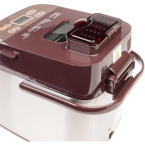 Номинальная потребляемая мощность 600 Вт Жидкокристаллический дисплей 19 программ приготовления Электронное управление Вес выпечки: 500 и 750 г 3 степени поджаривания корочки Отложенный старт до 15 часов Подогрев хлеба в течение 60 минут после приготовления Сохранение установленной программы при кратковременном отключении электричества Автоматический диспенсер для добавления ингредиентов Антипригарное покрытие контейнера для выпечки и лопасти для замешивания Ручка для переноски Прорезиненные ножки, препятствующие скольжению Большое смотровое окно Защита от перегрева Блокировка от детей Номинальное напряжение 220-240 В ~ Номинальная частота 50 Гц