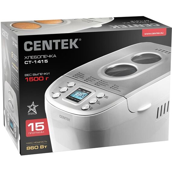 CENTEK CT-1415 Мощность860 Вт Вес выпечки1.5 кг Теплоизолированный корпус 2 ножа для замеса теста Звуковой сигнал Антипригарное покрытие пекарной камеры и ножей LCD-дисплей с подсветкой и цифровое управление Цвет корочки: светлый, средний, темный Защита от перегрева Съемный контейнер для запекания Автоматическая система подогрева в течение 1 часа Отсрочка старта15 ч. Отделка нержавеющей сталью Функция добавления ингредиентов во время приготовления Длина шнура1 м Запоминание выбранной программы в течение 15 минут после отключения электроэнергии даже без нажатия кнопки СТАРТ Аксессуары: мерный стаканчик, мерная ложка, крюк для вынимания пекарной камеры 15 автоматических программ: основной, французский хлеб, цельнозерновой, сладкий, молочный хлеб, без глютена, быстрый, кекс, замес теста, дрожжевое тесто, тесто для пасты, йогурт, джем, выпечка, ручная настройка