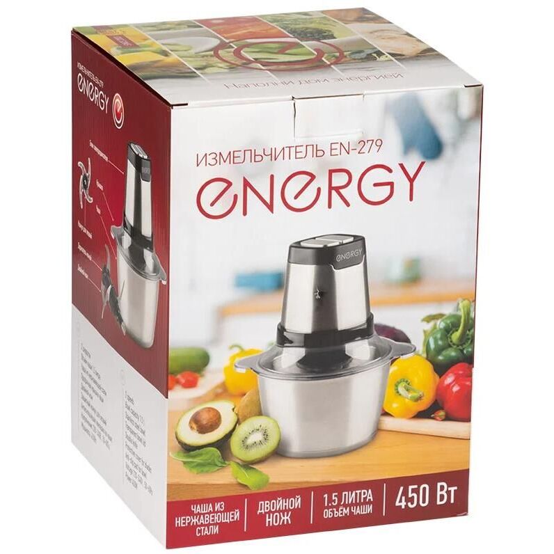 1 скорость Объём чаши 1,5 литра Чаша из нержавеющеё стали Прозрачная крышка чаши Двойной нож Защитный кожух для лезвий Длина шнура - 110 см Антискользящая накладка на чаше Мощность 450Вт