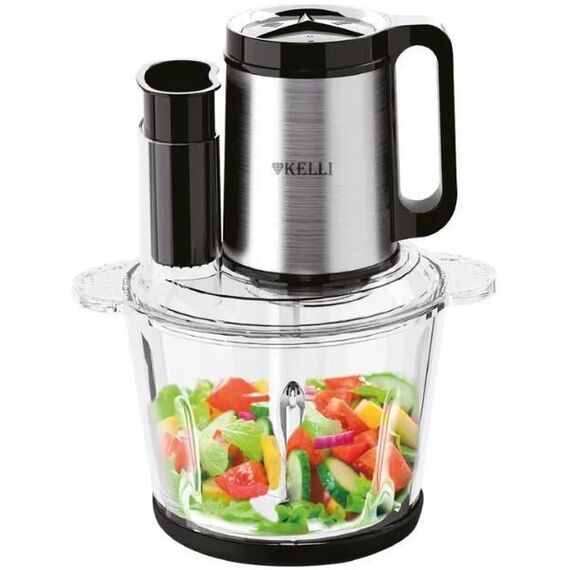 Чоппер-измельчитель 5в1 Мощность: 1500Вт Стеклянная чаша: 2,8л 3 скоростных режима Двухъярусный нож с 4-мя лезвиями Насадки: диск-терка двусторонняя, насадка для взбивания яиц, насадка для замешивания теста, насадка для очистки чеснока Противоскользящее основание Ножи из нержавеющей стали Механическое основание Сеть: 220-240В, 50Гц