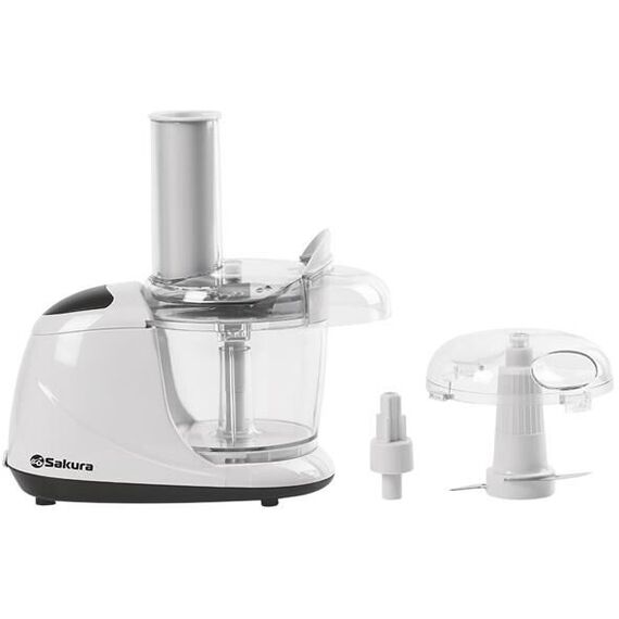 Чоппер с 2 доп. насадками. 400 Вт, 0,35 л, пластиковая чаша, 2 лезвия из нержавеющей стали, насадка для взбивания яиц и насадка для нарезки овощей, одна скорость, цвет белый.