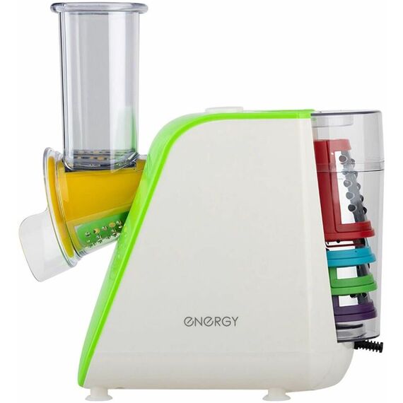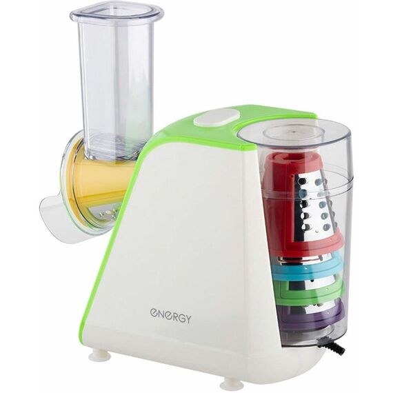 5 насадок для нарезки и шинковки: - для нарезки толстыми ломтиками - для нарезки тонкими ломтиками - для мелкой шинковки - для крупной шинковки - для измельчения 1 скорость Удобное хранение насадок Длина шнура 90 см Толкатель Мощность 250 Вт