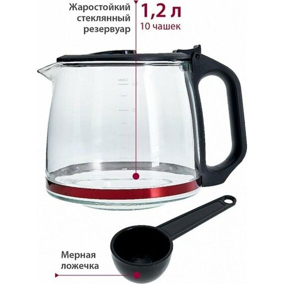 Мощность 680Вт. Вместимость 10 чашек. Корпус из высококач. пластика. Жаростойкий стекл. резервуар д/кофе. Шкала уровня воды. Свет. индикатор работы.Функция Антикапля. Система поддержания температуры. Защита от перегрева.