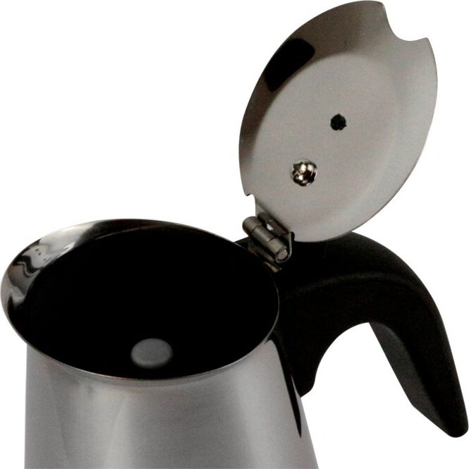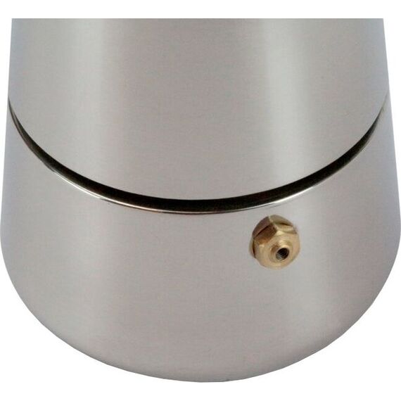 На 4 чашки. Нерж. сталь. Ручка и кнопка из нейлона (не нагреваются). Предохранительный клапан давления. Можно использ-ть на газ. плитах.Гейзер состоит из нижней емкости для воды, спец. сита-фильтра для кофе и верхнего чайничка для уже готового напитка.