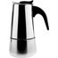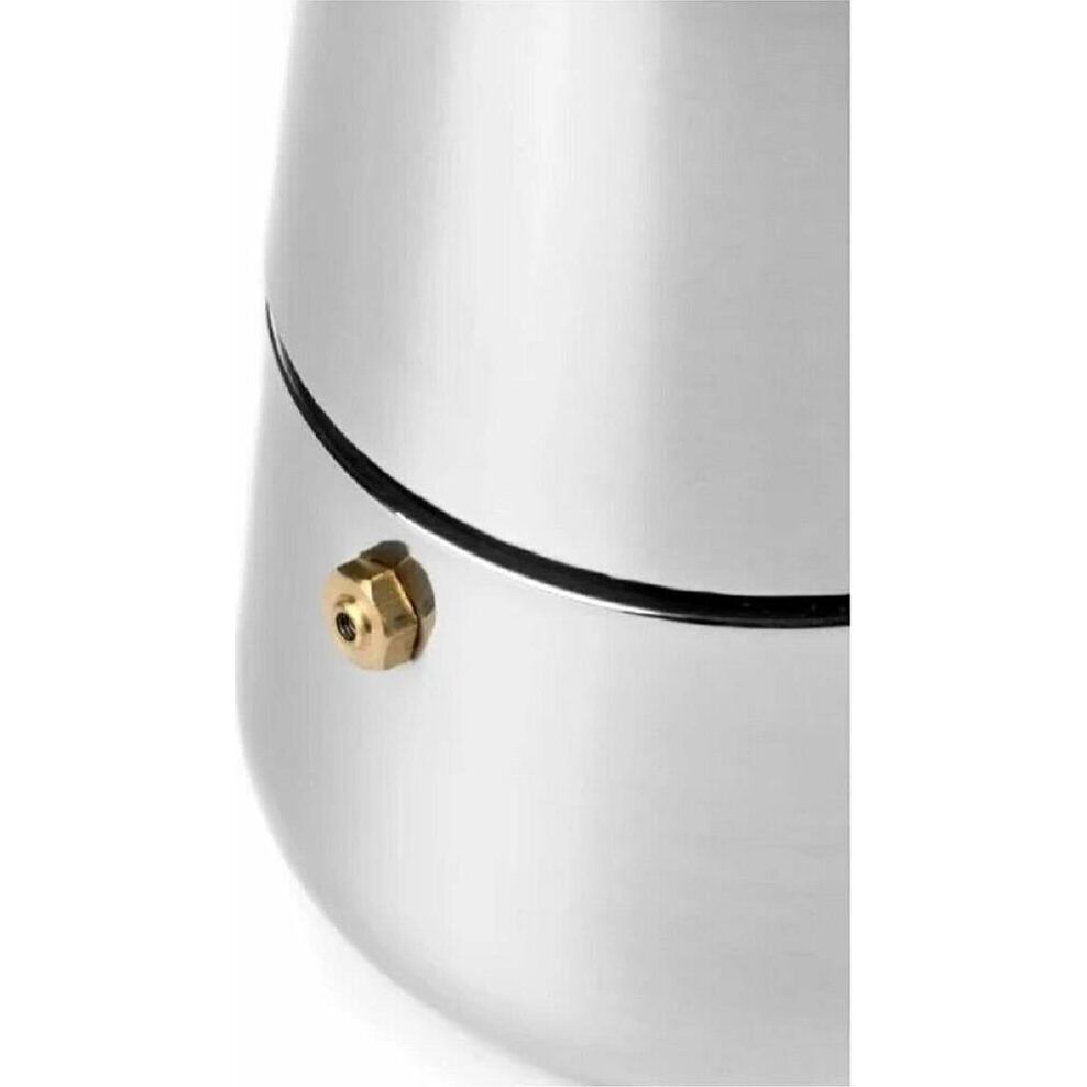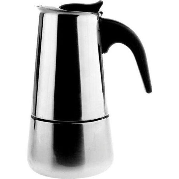 На 9 чашек. Нерж. сталь. Ручка и кнопка из нейлона (не нагреваются). Предохранительный клапан давления. Можно использ-ть на газ. плитах.Гейзер состоит из нижней емкости для воды, спец. сита-фильтра для кофе и верхнего чайничка для уже готового напитка.