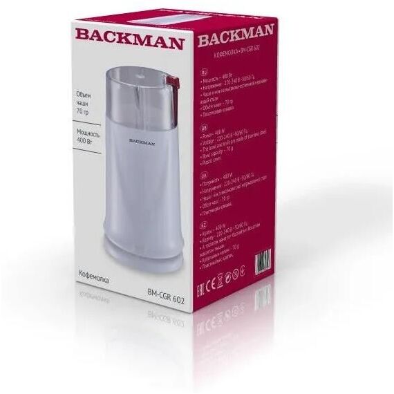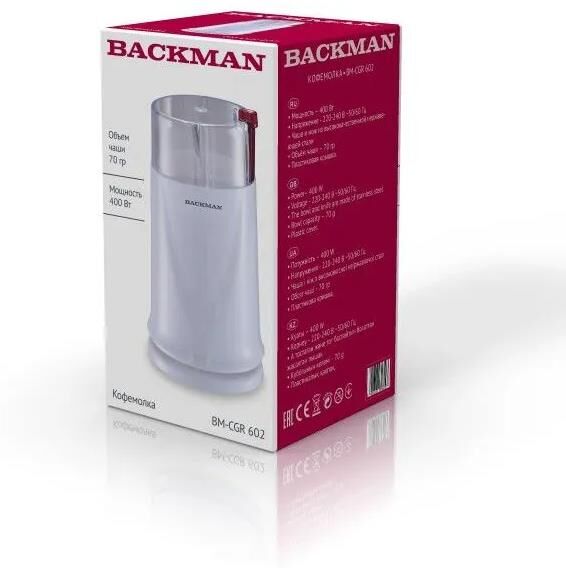 Кофемолка BACKMAN BM-CGR 602 400 W , 602 Кофемолка 400 W, вместимость 70 г. Пульсовый режим работы, блокировка включения при снятой крышке, пластиковая крышка, чаша и нож из высококачественной нержавеющей стали, защита от перегрева.