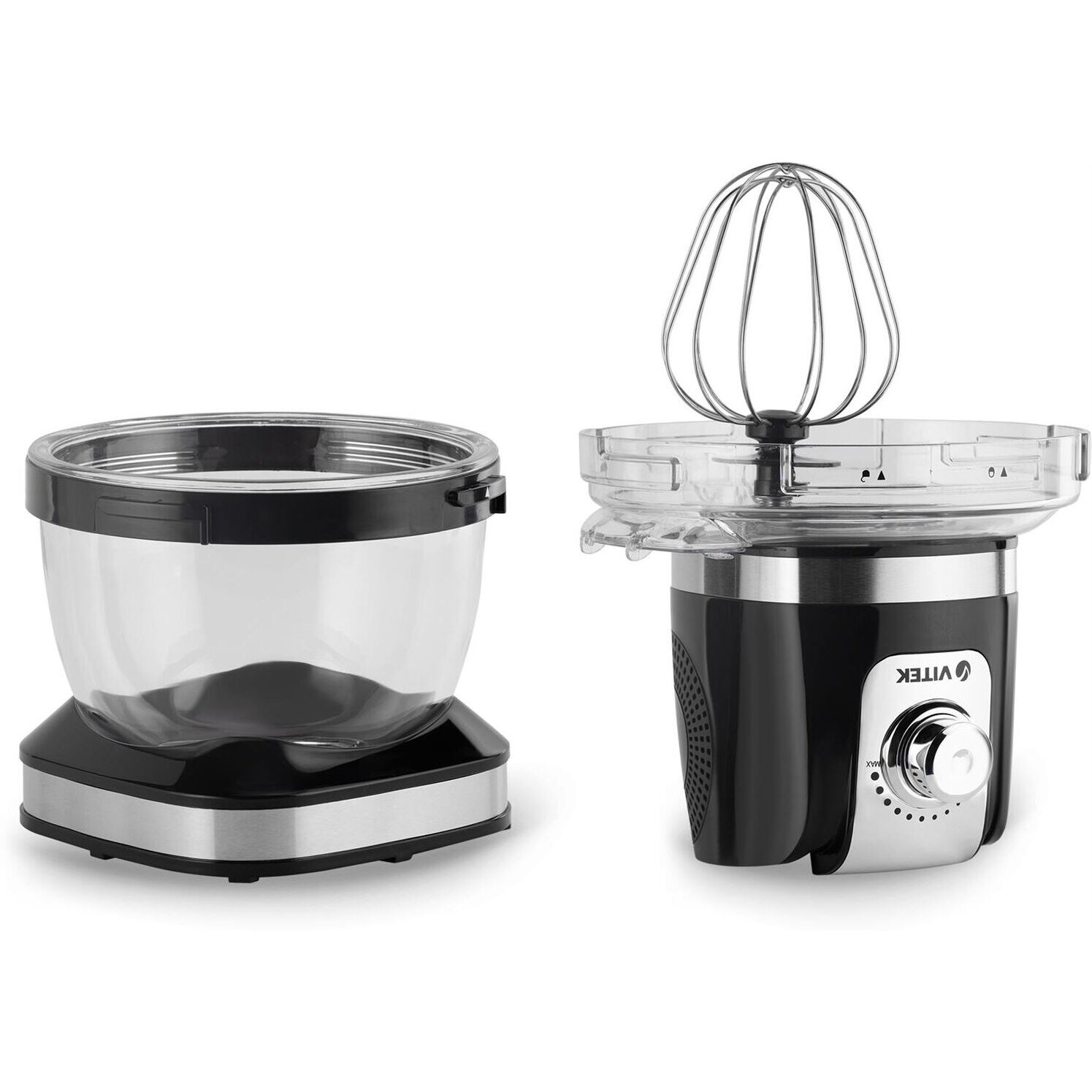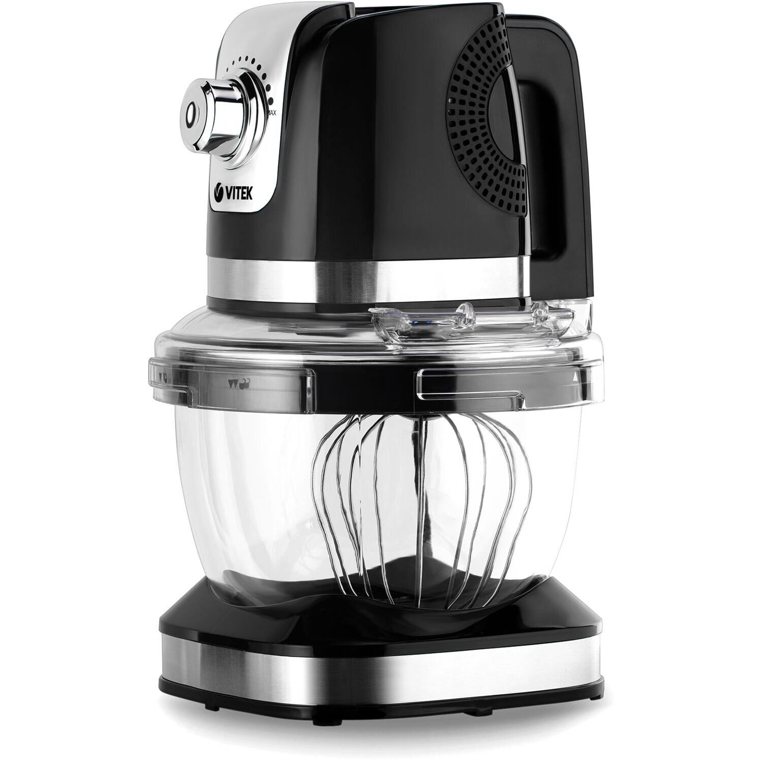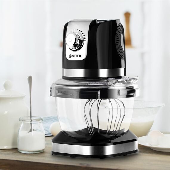 Кухонная машина. Мощность: 1000 вт, Число скоростей: 12, Венчик для взбивания: 1, Крюки для замешивания теста, Количество насадок: 3, Защитная крышка на чашу, Материал чаши стекло, Объем чаши: 4 литра, Материал корпуса: пластик, Вес: 5,1кг, Длина сетевого шнура: 120 см., Цвет: Черный/серебро
