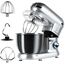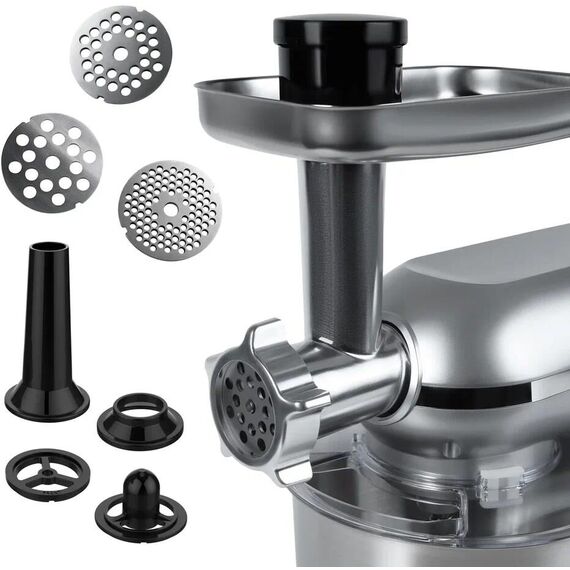 мощность 1500 Вт с 6 скоростями и импульсным режимом (от 70 до 220 об/мин) станет незаменимым помощником на кухне. Прибор работает от сети 220-240 В (50-60 Гц) и оснащен 4.5-литровой чашей из нержавеющей стали и 1.5-литровым стеклянным блендером, сочетая функции мясорубки, блендера, планетарного миксера и овощерезки (докупается отдельно). Прочный АБС-пластиковый корпус в железно-сером цвете дополнен LED-индикатором работы и удобным рычагом для подъема рабочей головки. Особенности включают плавную регулировку скорости, импульсный режим, ножки-присоски для устойчивости и простую смену насадок. В комплекте: металлическая чаша, защитная крышка, крюк для теста, плоский битер, венчик для взбивания, блендер, мясорубка (с насадками для колбасок и кеббе), руководство пользователя. Устройство упаковано в подарочную и транспортировочную коробки, а уровень шума менее 75 дБ делает работу комфортной. Идеальный выбор для профессиональных кулинаров и домашних поваров.