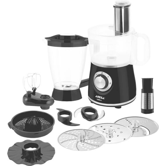 AR-1701 Чаша для измельчения Нож для измельчения Чаша блендера Венчик для взбивания Насадка для густого теста Диск для приготовления эмульсий Насадка для отжима сока из цитрусовых Фильтр для отжима сока из ягод Диск-тёрка для драников Двусторонний диск для тёрки и крупной нарезки Двусторонний диск для шинковки и мелкой нарезки Толкатель Характеристики Мощность: 750 Вт Объем чаши блендера: 1,75 л Объем чаши для измельчения: 1,2 л Режимы: Блендер, Измельчение, Нарезка, Шинковка, Смешивание, Взбивание, Терка