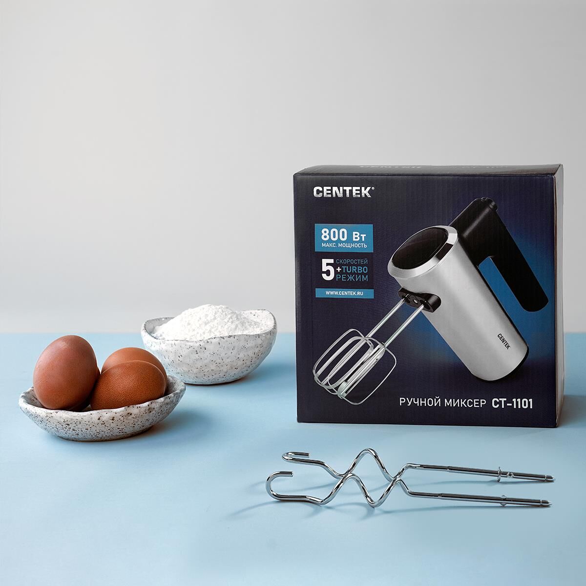 Миксер Centek CT-1101 – производительная и тихая ручная модель мощностью 800 Вт. Прибор имеет 5 скоростей работы и турборежим, быстро и равномерно смешивает и взбивает различные ингредиенты. Турборежим служит для ускорения получения нужного результата. В комплект к миксеру входят 2 венчика для взбивания, замешивания жидкого теста и 2 крюка для замешивания густого теста, фарша.