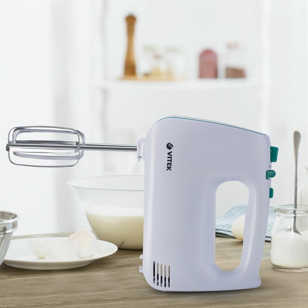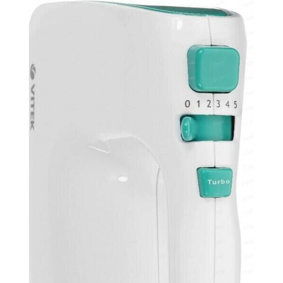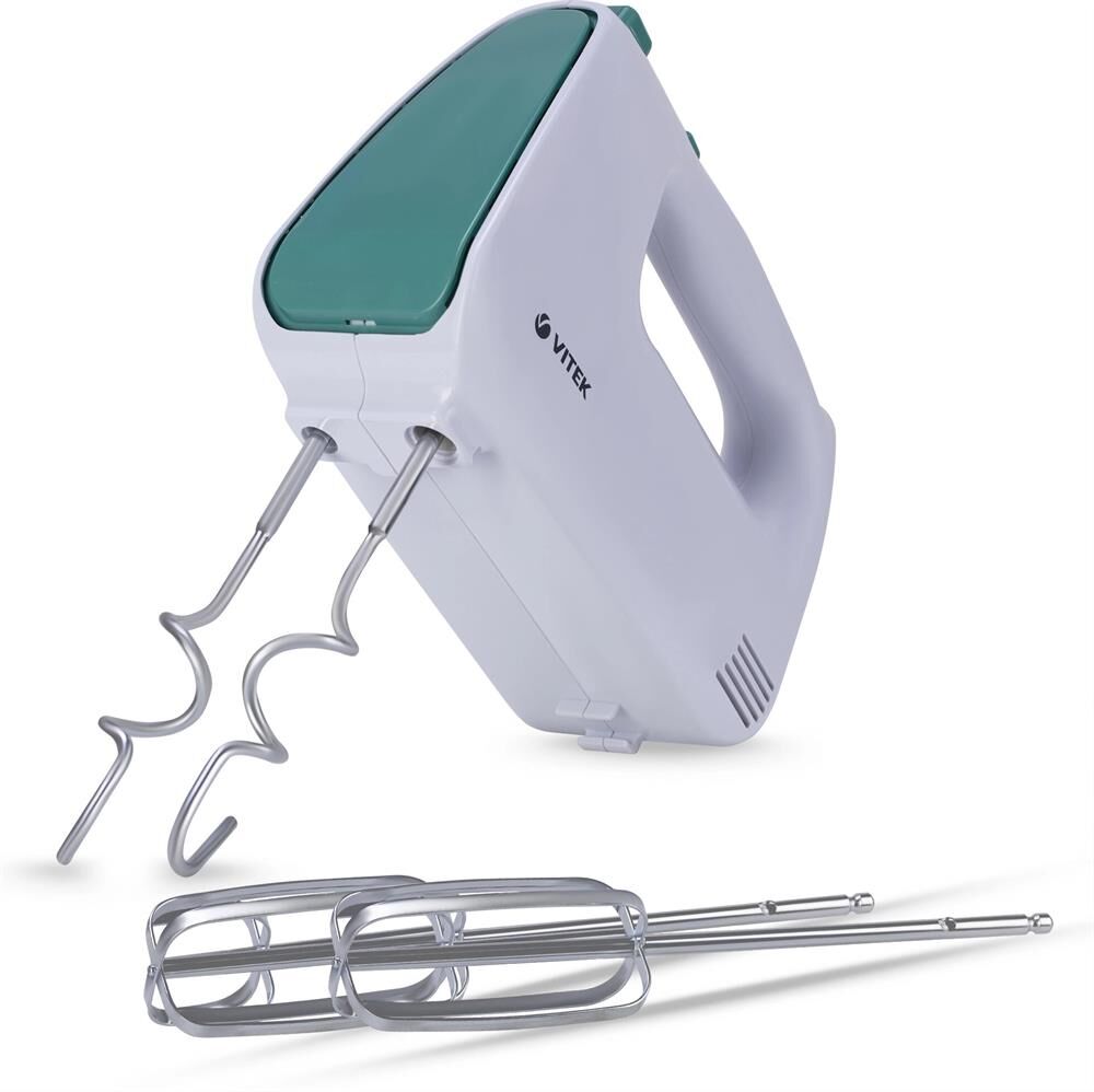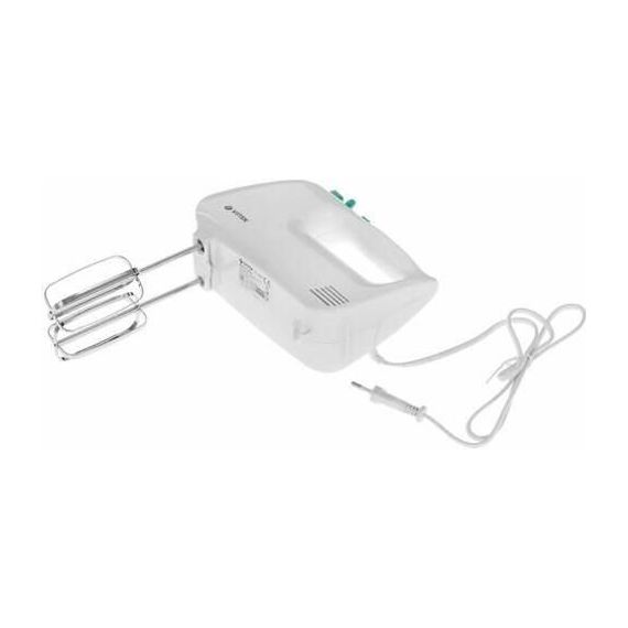 Миксер ручной. Мощность: 600 вт, Число скоростей: 5, Турборежим, Венчик для взбивания: 2, Крюки для замешивания теста, Количество насадок: 4, Кнопка отсоединения насадок, Материал корпуса: пластик, Длина сетевого шнура: 120 см, Цвет: Белый/зеленый.