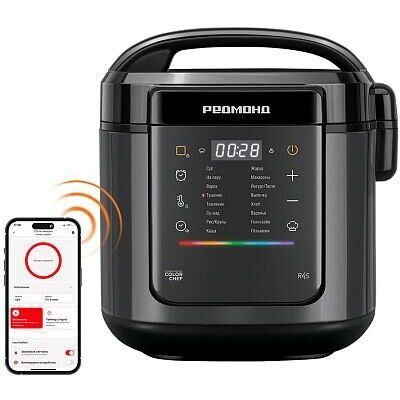 Умная мультиварка. Тип управления: дистанционный (Ready for Sky REDMOND)/электронный (сенсорный). Голосовой помощник: Алиса/Маруся. Объем чаши: 5 литров (полезный объем: 4 литра). Антипригарное покрытие чаши DAIKIN (Япония). Передача данных через Wi-Fi. Поддержка на операционных системах: Android/iOS. Материал корпуса: металл/пластик. Защита от поражения электрическим током: класс I. (2 вида датчиков защиты: невозвратная термозащита/электронные ошибки серии Е). 18 автоматических программ. Съемные: паровой клапан и внутренняя крышка. LED дисплей с подсветкой, Автоподогрев, Таймер до 24 часов, Блокировка панели управления, Звуковой сигнал, Отложенный старт до 24 часов, Пастеризация, Стерилизация. Длина шнура: 1,2 метра. Доп. возможности: приготовление сыра, творога, фондю. Габариты: 285*307*273 мм. Комплектация: книга рецептов, контейнер для приготовления на пару, мерный стакан, мультиварка, плоская ложка, руководство по эксплуатации, сервисная книжка, чаша, черпак, шнур питания.