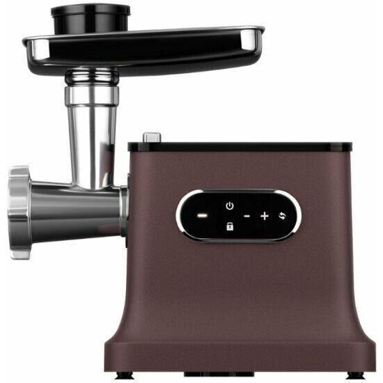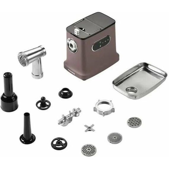 Мясорубка электронная. Максимальная мощность: 100 Вт (номинальная: 400Вт). Материал корпуса: пластик. Материал лотка: металл. Материал нода: нержавеющая сталь. Производительность: до 2 кг/мин. Максимальное время непрерывной работы: 3 минуты. Индикация работы. Насадки для кеббе и колбасок. Количество перфорированных дисков для фарша: 3шт. Реверс. Защита от перегрева. Отсек для насадок. Нескользящие устойчивые ножки. Двигатель: DC. Длина шнура: 1,2 метра. Габаритные размеры: 180*330*360 мм. Комплектация: блок мясорубки, загрузочный лоток, моторный блок, нож мясорубки, основание насадки для кеббе, перфорированные диски для фарша (3 шт.), руководство по эксплуатации, сервисная книжка, толкатель, фиксирующее кольцо, формирующая насадка для кеббе, формирующая насадка для колбасок, шнек мясорубки.