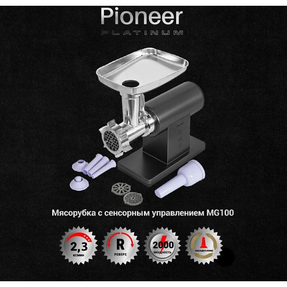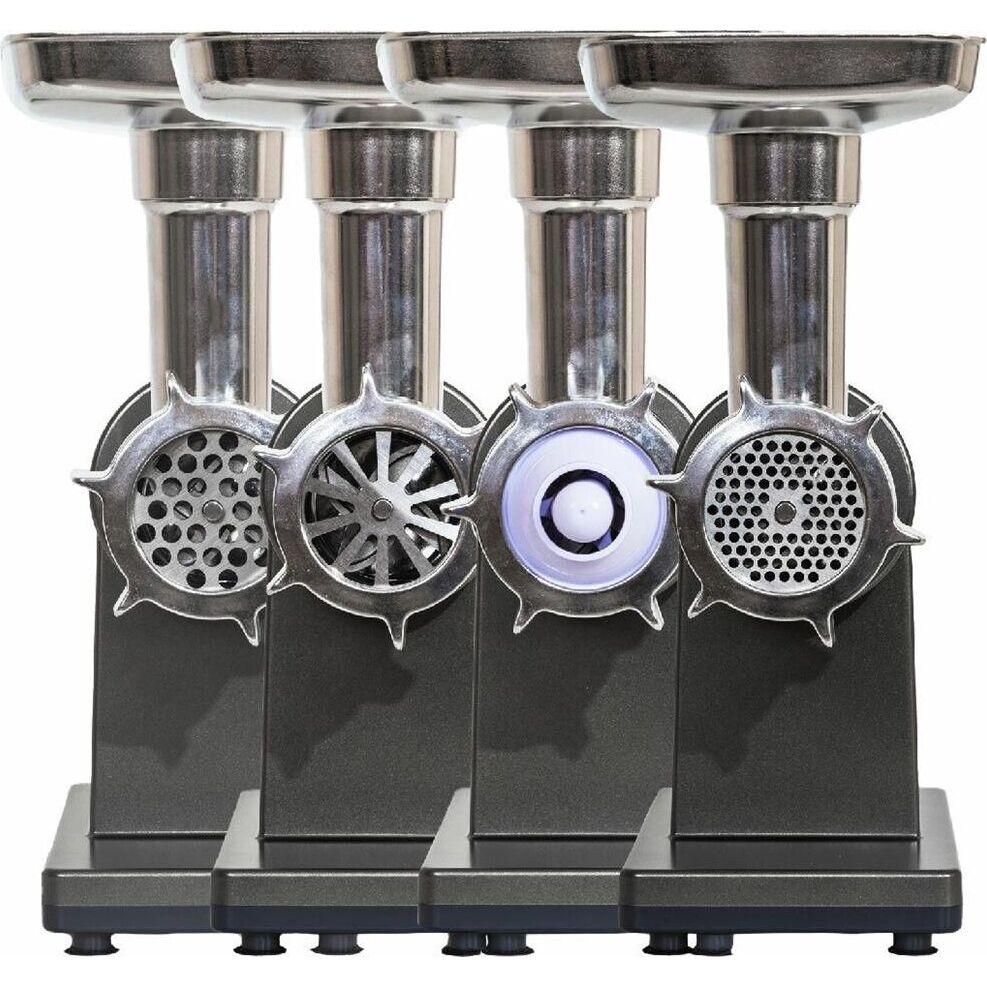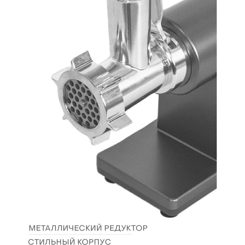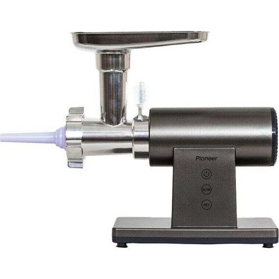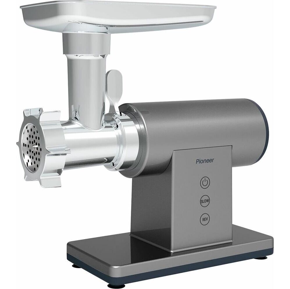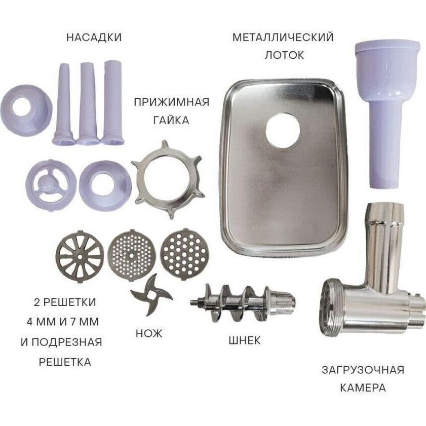 Мясорубка, Мощность 2000 Вт, Высокая производительность до 2,3 кг. мяса в минуту, Сенсорное управление, 2 скорости работы для эффективной обработки разных продуктов, Функция реверса, 3 решетки из нержавеющей стали в комплекте: 4 мм, 7 мм, подрезная, Насадки для формирования колбасок разного размера 14\20\22 мм и кеббе, Профессиональный алюминиевый замок головки мясорубки, Толкатель для продуктов, Нож из высококачественной стали, Металлический лоток, Пластиковый корпус, Длина шнура 1 м, Противоскользящие резиновые ножки