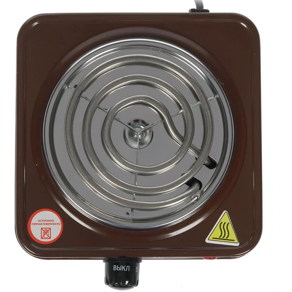 Номинальная потребляемая мощность 1000 Вт. Количество конфорок 1 штука. Эмалированная рабочая поверхность. Цвет эмали: коричневый. Спиралевидная электроконфорка. Поворотный механический переключатель. Световой индикатор работы. Терморегулятор. Упаковка: цветная коробка.