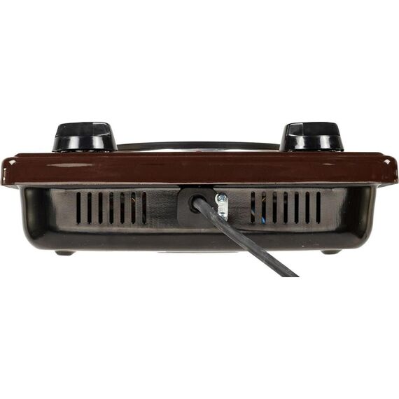(ШхГхВ) 29х51х10 см.Цвет коричневый.Установленная мощность: 2.2 кВт Масса нетто: 6 кг Количество конфорок: 2 Мощность передней конфорки: 0.7 кВт (145 мм) Мощность задней конфорки: 1.5 кВт (180 мм) Бесступенчатая регулировка мощности.