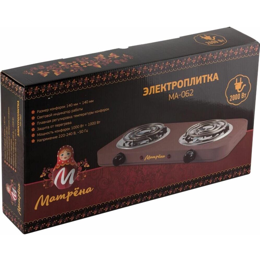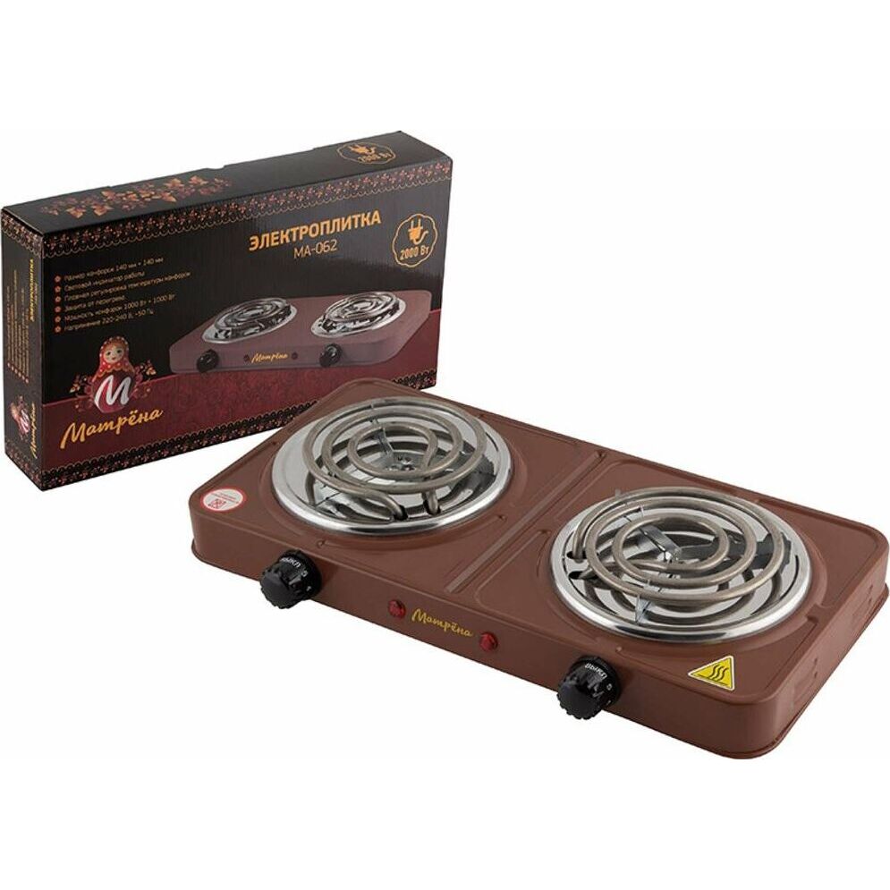 Размер конфорки 140 мм, СРазмер конфорок 140 мм + 140 мм, Световой индикатор работы, Плавная регулировка температуры конфорки, Защита от перегрева, Мощность конфорок 1000 Вт + 1000 Вт, Цвет коричневый.