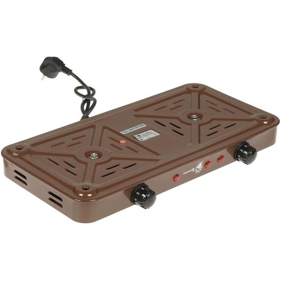 Номинальная потребляемая мощность 2000 Вт, Количество конфорок 2 штуки, Эмалированная рабочая поверхность, Цвет эмали: коричневый, Спиралевидные электроконфорки, Поворотные механические переключатели, Световой индикатор работы, Терморегулятор, Ножки - 4 штуки.