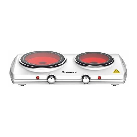 Плитка настольная с инфракрасным нагревом, 2 стеклокерамических конфорки, мощность 1200Вт / 900Вт, диаметр конфорок 16.5см / 14см, размер прибора - 475*275*83мм, максимальная температура нагрева 530-570С, максимальная нагрузка на плиту 16кг (по 8кг на конфорку), механическое управление, световой индикатор, шнур 0,8 м, цвет белый