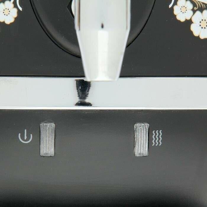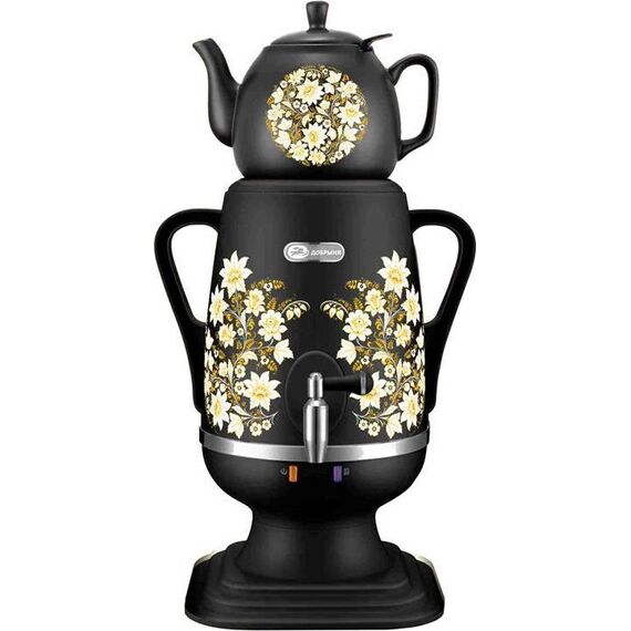 Объём: 4 л. Материал: пластик. Цвет: чёрный с росписью. Керамический заварочный чайник 1 л со съёмным фильтром из нержавеющей стали в комплекте/высота 145мм. Хромированный кран. Функция термопота. Мощность при закипании 1850 Вт. Мощность в режиме подогрева 100 Вт. Напряжение сети 220 В Дисковый нагреватель, световая индикация работы, автоматическое отключение, защита от перегрева при выкипании воды