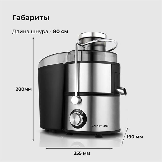 Соковыжималка Galaxy LINE GL 0809, серебристый, центробежная, 1200 Вт, 19 000 об/мин, 2 скорости, емкость для сока 0,5 л
