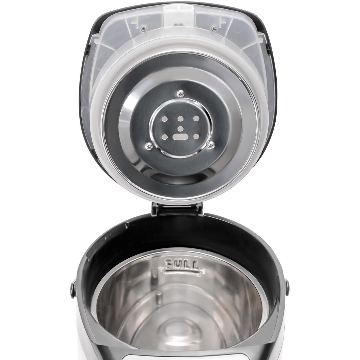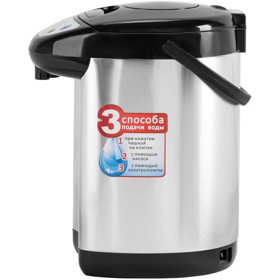 Мощность в режиме кипячения 900Вт. Объем 3,8л. 3 способа подачи воды: при нажатии чашкой на клапан, с помощью насоса, с помощью электропомпы. Функция повторного кипячения. Колба из нерж. стали. Ручка для переноски.