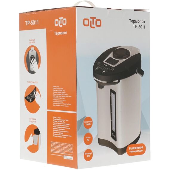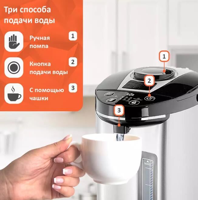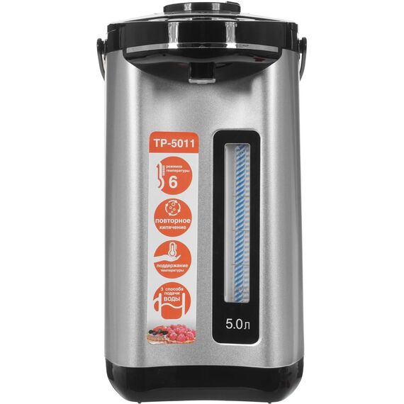 Объем: 5л Мощность: 750Вт Металлический корпус Защита от перегрева Три вида налива: помпа, кнопка, чашка Защита от детей Индикатор уровня воды с подсветкой Вращение на 360° Цвет: серебристый/черный Функция поторного кипячения Регулировка t°: 6 режимов (95, 85, 65, 55, 45, без нагрева) Комплектация: Термопот, инструкция, гар.талон Габаритые размеры: 220 мм х 400мм х 290мм Вес: 2,41кг