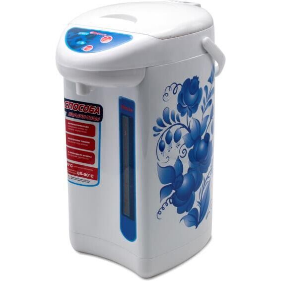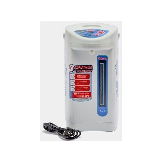 4,2 л, 750 Вт, повторное кипячение, поддержание температуры, 3 способа подачи воды (помпой, кнопкой на панели. нажатием чашкой), колба нерж.сталь, съёмная крышка, белый.