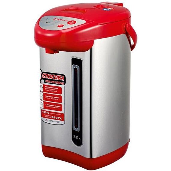 5,0 л, 750 Вт, повторное кипячение, поддержание температуры, 3 способа подачи воды (помпой, кнопкой на панели, нажатием чашкой), колба нерж.сталь. Цвет: металлик + красный.