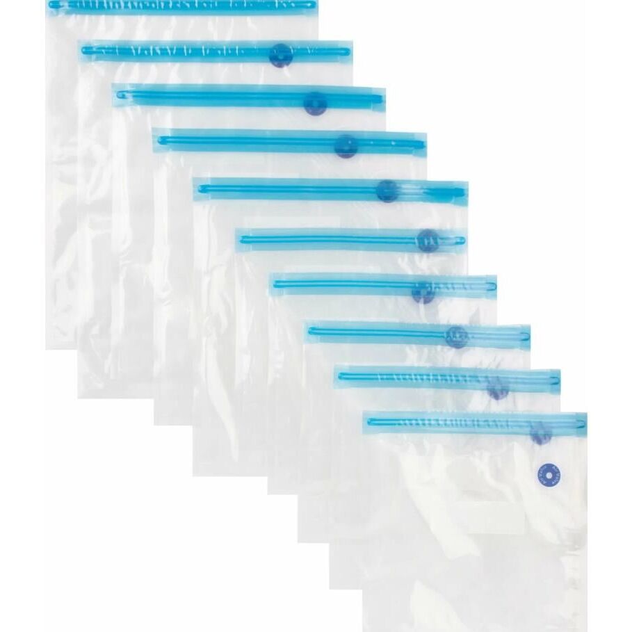 насос - 1шт размер 26x34 см (0,9 л) - 2 шт размер 26x28 см (0,7 л) - 3 шт размер 22x21 см (0,5 л) - 5 шт клипса для закрывания - 2 шт материал: полиамид, полиэтилен, пластмасса Упаковка: пакет, хедер