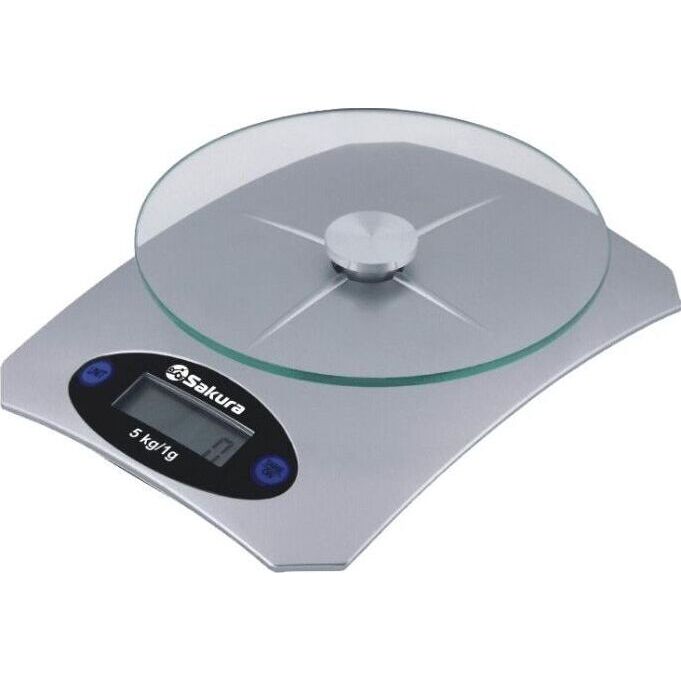 Весы кухонные электронные, максимальная нагрузка 5 кг, цена деления 1 г, ЖК дисплей, учет веса тары, автоматическое отключение, индикатор перегрузки и заряда батарейки, питание 1х3В (CR2032), пластиковый корпус, стеклянная платформа диаметром 15 см, цвет: серебристый Инструкция