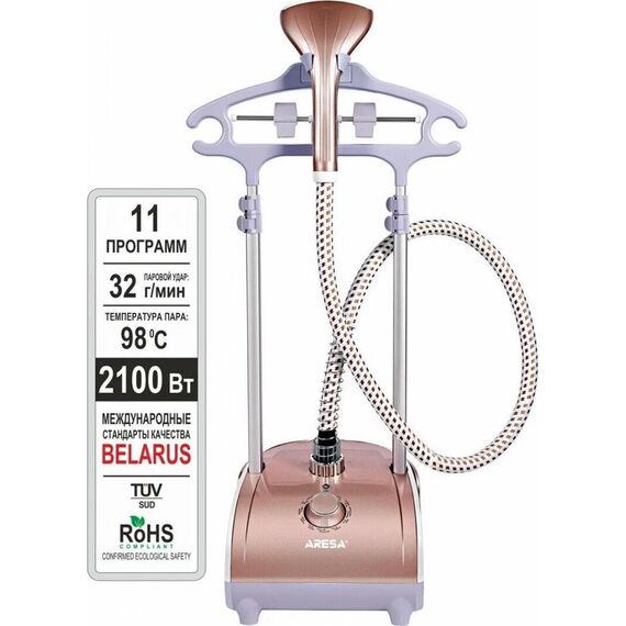 Мощность: 1800-2100 Вт. Паровой удар: 32 г/мин. Температура пара: 98°C. Готовность к работе: 38 сек. Резервуар для воды: 2200 мл. Длина шнура: 1,2 м. 11 режимов для разных видов ткани. Покрытие подошвы утюжка из нержавеющей стали. Двухопорная телескопическая стойка с вешалкой. Натяжитель для брюк. Щётка для очистки одежды. Тефлоновая варежка. Гладильная доска.