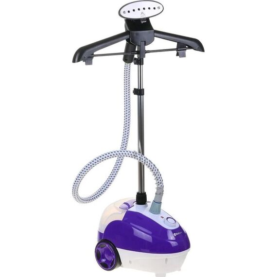 Мощность: 1700 Вт.Тип управления: механический.Объем резервуара для воды: 1,5 л.Готовность к работе: 45 секунд.Время непрерывной работы: до 40 минут. Температура пара: 98?С.Максимальный поток пара: 30 мл/мин.Режимы работы: 2. Горизонтальное отпаривание.Отключение при перегреве.Клапан для слива воды: Материал корпуса: пластик.Дополнительные характеристики: гибкий паровой шланг (1,45 м), металлическая телескопическая штанга, сопло из нержавеющей стали Комплектация: складная вешалка с зажимами для брюк, насадка для проглаживания стрелок на брюках, насадка-щетка, защитная рукавица Компактное хранение.