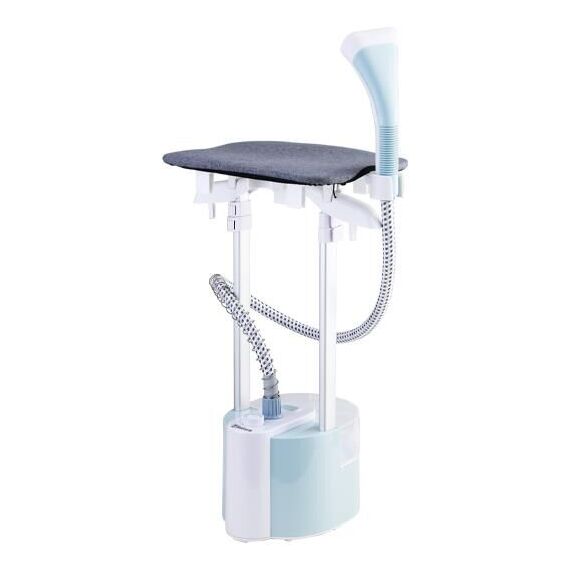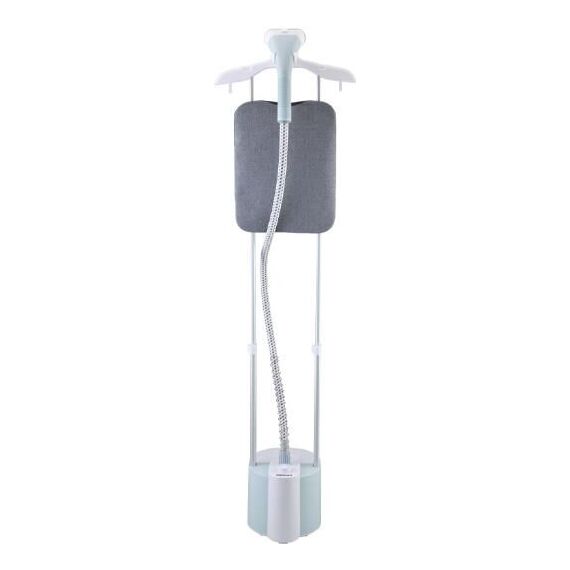 Отпариватель; Мощность: 2100 Вт; Съемный резервуар для воды: 1,8 л; До 65 минут непрерывной работы; Две металлические телескопические стойки; Готовность к работе через 45 секунд после включения; Два режима подачи пара: 25г/мин и 40г/мин; Максимальная температура пара: 100 °C,; Высота в собранном виде: 1,55м; Гибкий шланг для подачи пара; Длина шнура питания: 1,7м; Размер устройства в упаковке: 420*310*325мм; В комплекте: отпариватель, гладильная доска, термостойкая защитная рукавица, универсальная насадка для отпаривания, съемная щетка для насадки, 2 металлические телескопические стойки, плечики для одежды; Цвет: белый / голубой