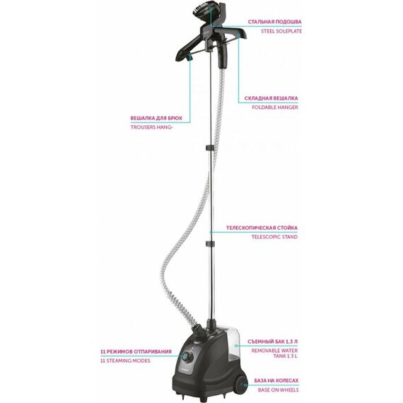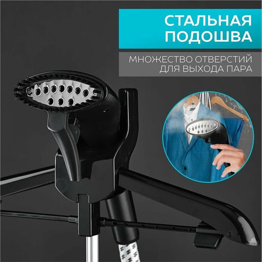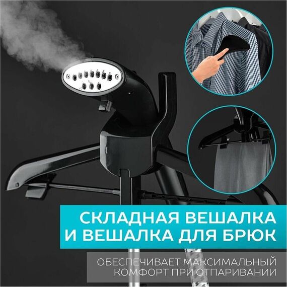 Тип: Вертикальный Мощность, Вт: 1950 Регулируемый пар до г/мин: 32 Резервуар для воды, мл: 1300 Покрытие подошвы: Стальная подошва Вешалка для одежды: Да Вешалка для брюк: Да Готовность к работе, сек: 38 Регулировка степени отпаривания: 11 режимов отпаривания Длина электрошнура, м: 1.35 Цвет: Черный