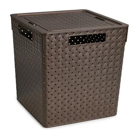 ЦВЕТ: венге. РАЗМЕР ИЗДЕЛИЯ: 294 х 294 х 301 мм. МАТЕРИАЛ: Полипропилен. Емкость из пищевого пластика для хранения и переноски мелких аксессуаров и продуктов питания. В объеме 23л корзинки оптимальны для хранения одежды и обуви, овощей и корнеплодов, книг и игрушек и пр. Изделие имеет ручки с четырех сторон, что удобно для использования и переноски. Бортик по периметру крышек обеспечивает фиксацию при штабелировании корзинок друг на друга.