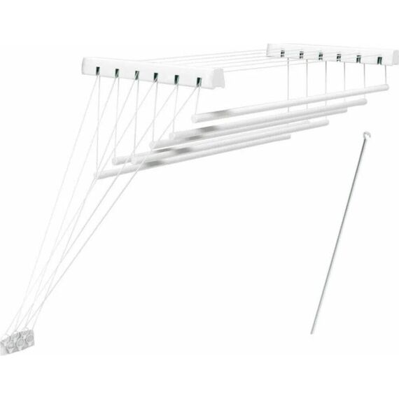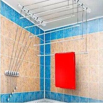 ЦВЕТ: белый. РАЗМЕР ИЗДЕЛИЯ: 430 x 1 200 x 1 350 мм. МАТЕРИАЛ: металл + полипропилен. Представляет из себя конструкцию из крепежных кронштейнов, штанг-трубок, на которых развешивается бельё, и веревочной системы для фиксирования штанг на двух разных положениях: на высоте комфортной для развешивания белья и на высоте для сушки белья. Суммарная длина поверхности для размещения белья - 7,2м. Максимальная нагрузка - 12кг.